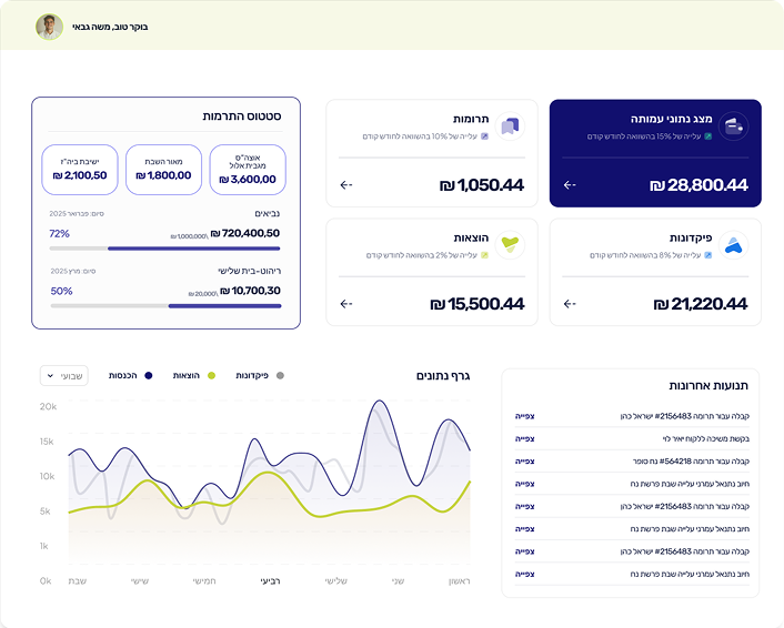 ניהול עצמאי של עמותות מעולם לא היה קל יותר, מערכת ניהול העמותות שלנו מסדרת לך את כל מה שאתה צריך ומאפשרת לך שליטה אמיתית על כל שקל.